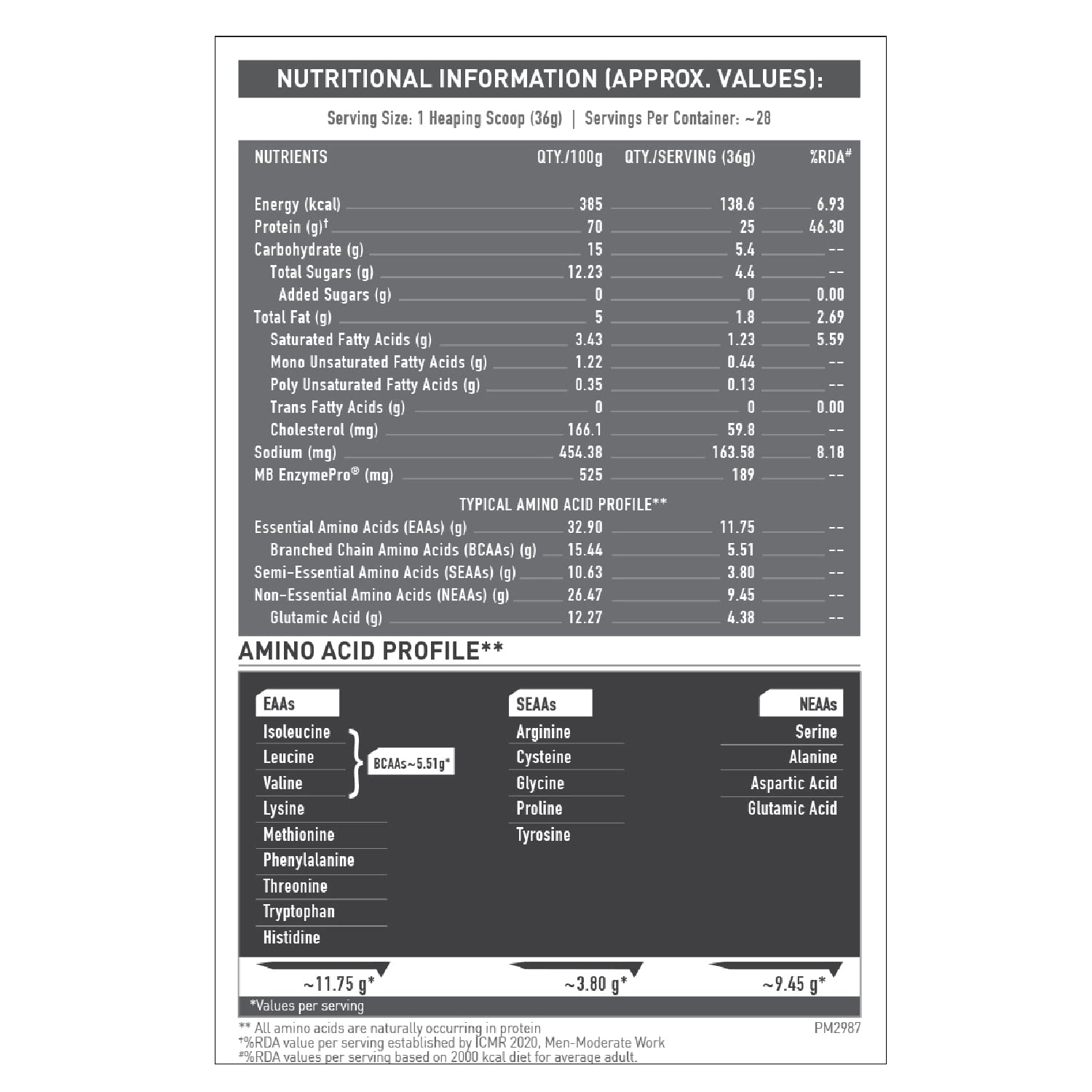 MB Biozyme Performance Whey comes with a proprietary international patent-pending Enhanced Absorption Formula (EAF ®) that ensures 50% higher protein absorption & 60% superior BCAA absorption when compared to other whey proteins