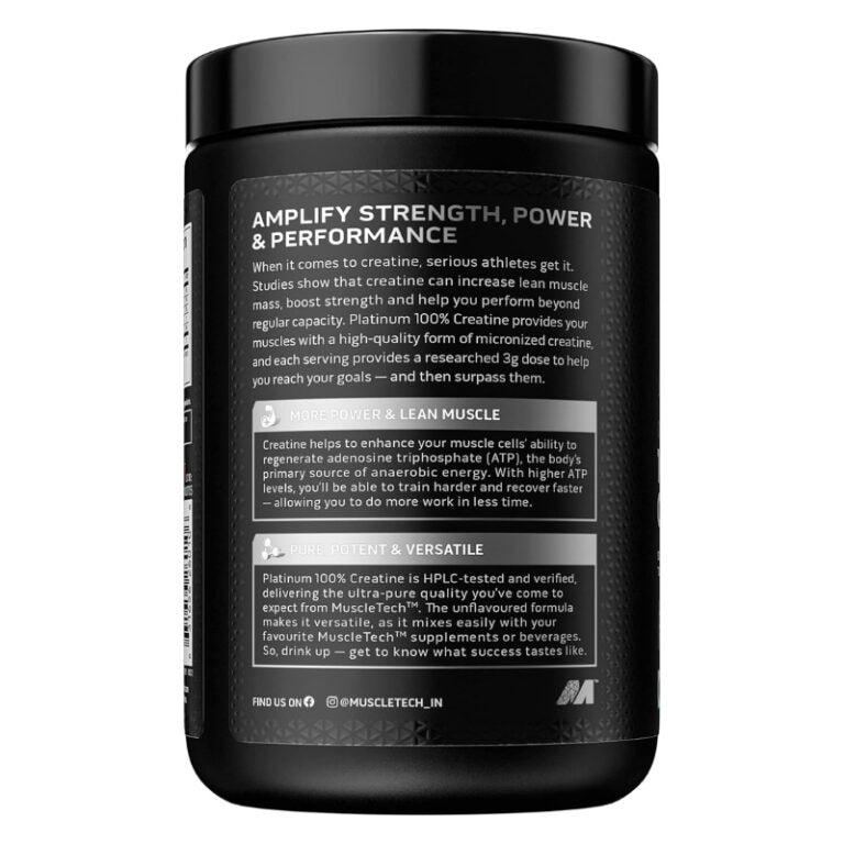 CREATINE MONOHYDRATE POWDER – MuscleTech Platinum Creatine delivers 3g of 100% pure, HPLC-tested, micronized creatine monohydrate to increase lean muscle, improve strength and muscle endurance