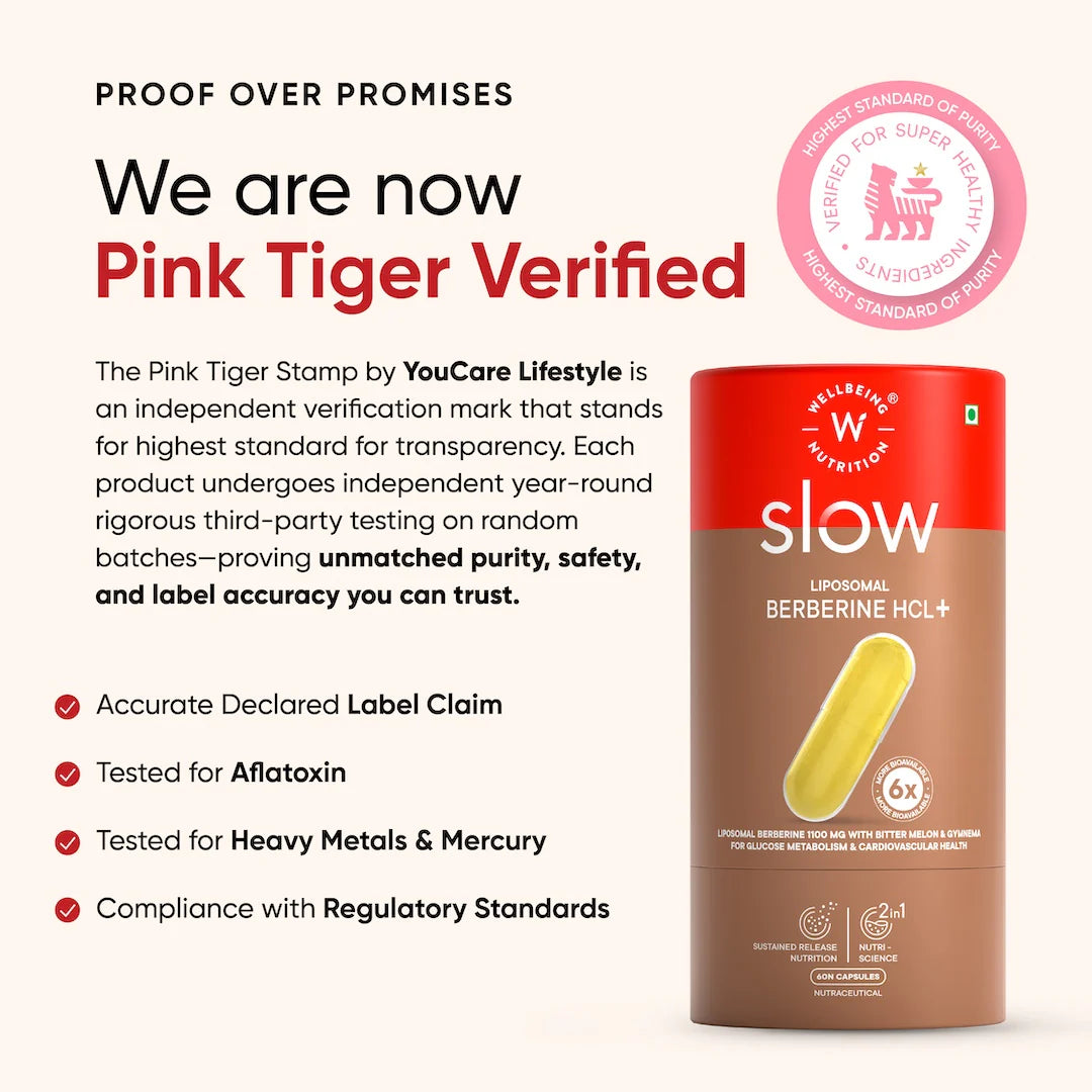 India’s first liposomal Berberine HCL+ that delivers a highly bioavailable dose of 1100 mg of Berberine extracted from pure himalayan berberis arristata roots, is 13.6x highly absorbed vs standard berberine. A potent metabolism activator combined with Karela (Bittermelon), Gudmar (Gymnema), Cinnamon & Chromium, it helps regulate hunger & satiety, enhances fat burning, improves insulin sensitivity, promotes glucose metabolism, regulates hormonal imbalance and enhances cellular function.